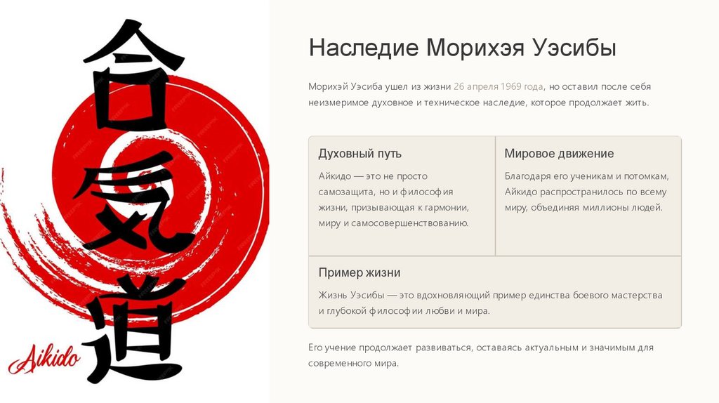 Наследие Морихэя УэсибыМорихэй Уэсиба ушел из жизни 26 апреля 1 969 года, но оставил после себя