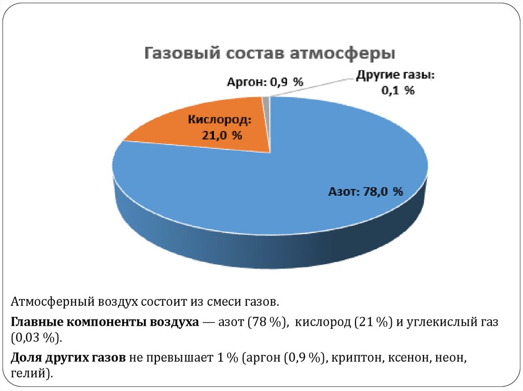 Атмосферный воздух состоит из смеси газов.Главные компоненты воздуха — азот (78 %), кислород (21 %) и углекислый газ