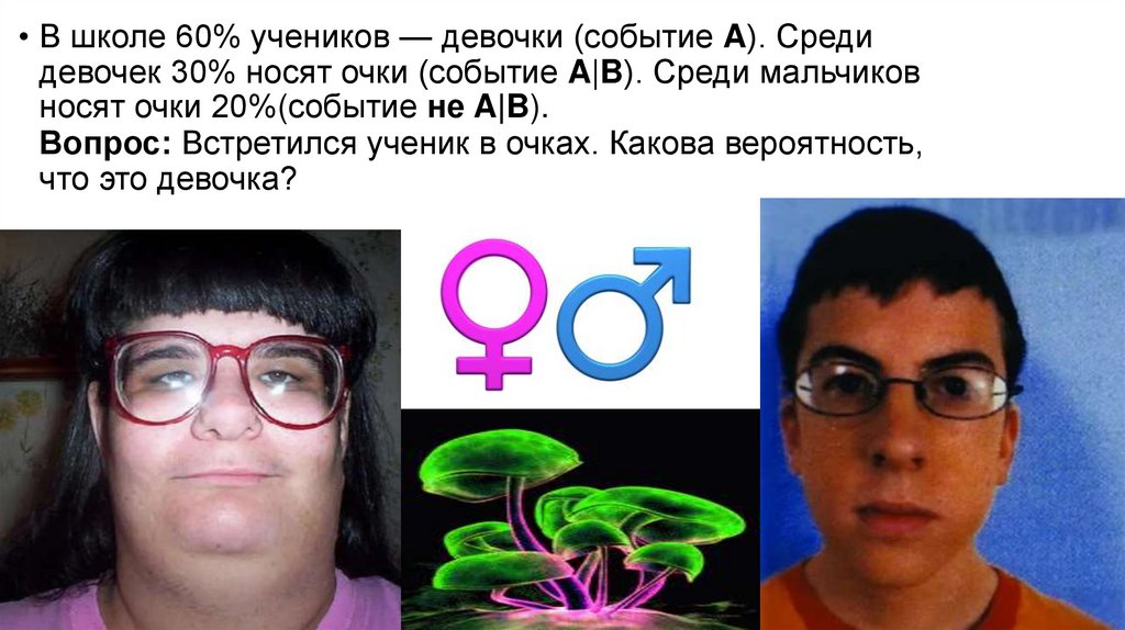 • В школе 60% учеников — девочки (событие A). Средидевочек 30% носят очки (событие A|B). Среди мальчиков