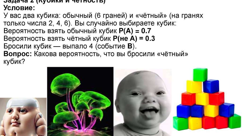 4. Задача 2 (Кубики и чётность) Условие: У вас два кубика: обычный (6 граней) и «чётный» (на гранях только числа 2, 4, 6). Вы