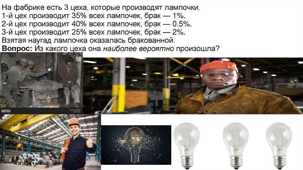 5. На фабрике есть 3 цеха, которые производят лампочки. 1-й цех производит 35% всех лампочек, брак — 1%. 2-й цех производит 40%