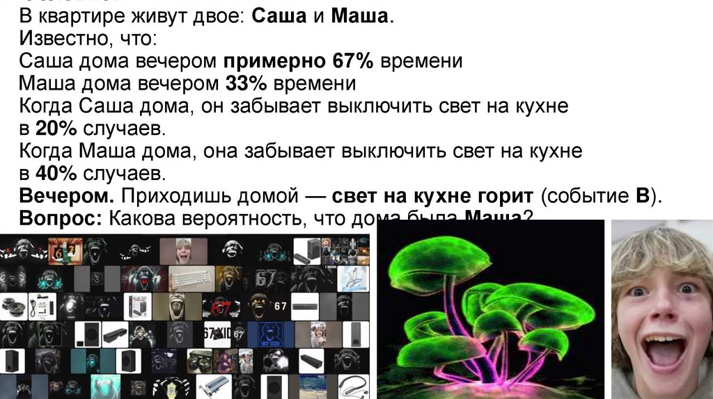 6. Условие: В квартире живут двое: Саша и Маша. Известно, что: Саша дома вечером примерно 67% времени Маша дома
