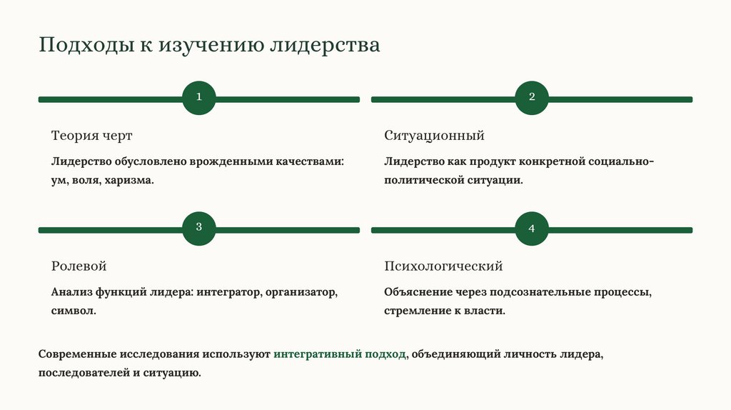 Современные исследования используют интегративный подход, объединяющий личность лидера,