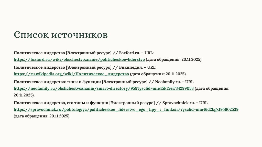 Список источниковПолитическое лидерство [Электронный ресурс] // Foxford.ru. – URL: