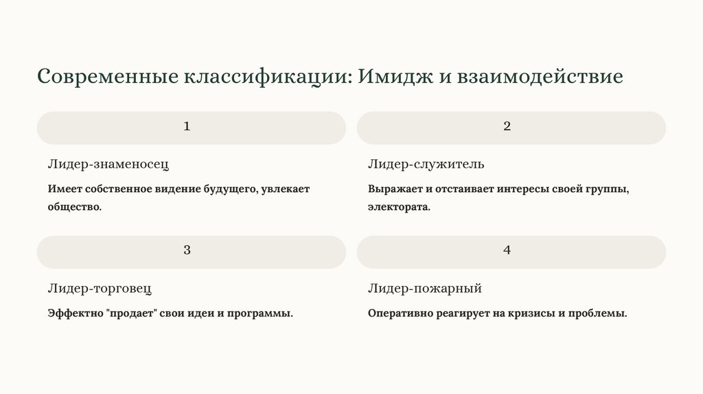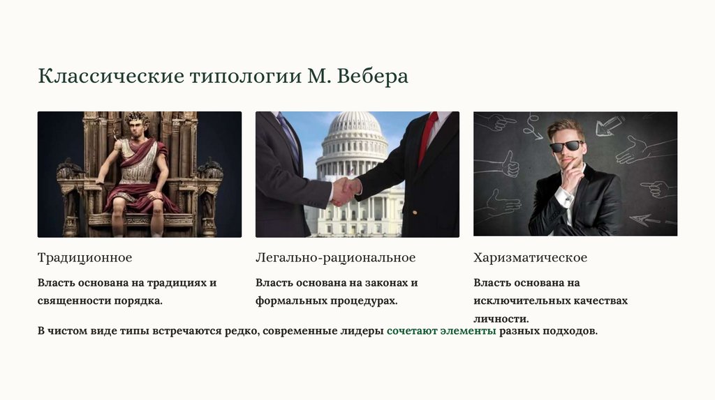 В чистом виде типы встречаются редко, современные лидеры сочетают элементы разных подходов.