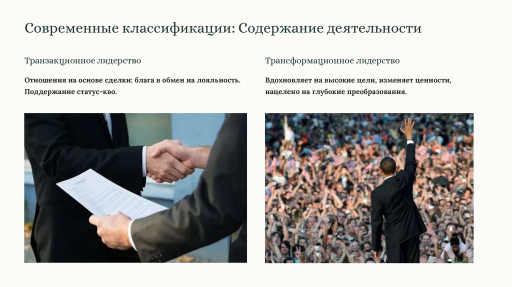 Современные классификации: Содержание деятельностиТранзакционное лидерство