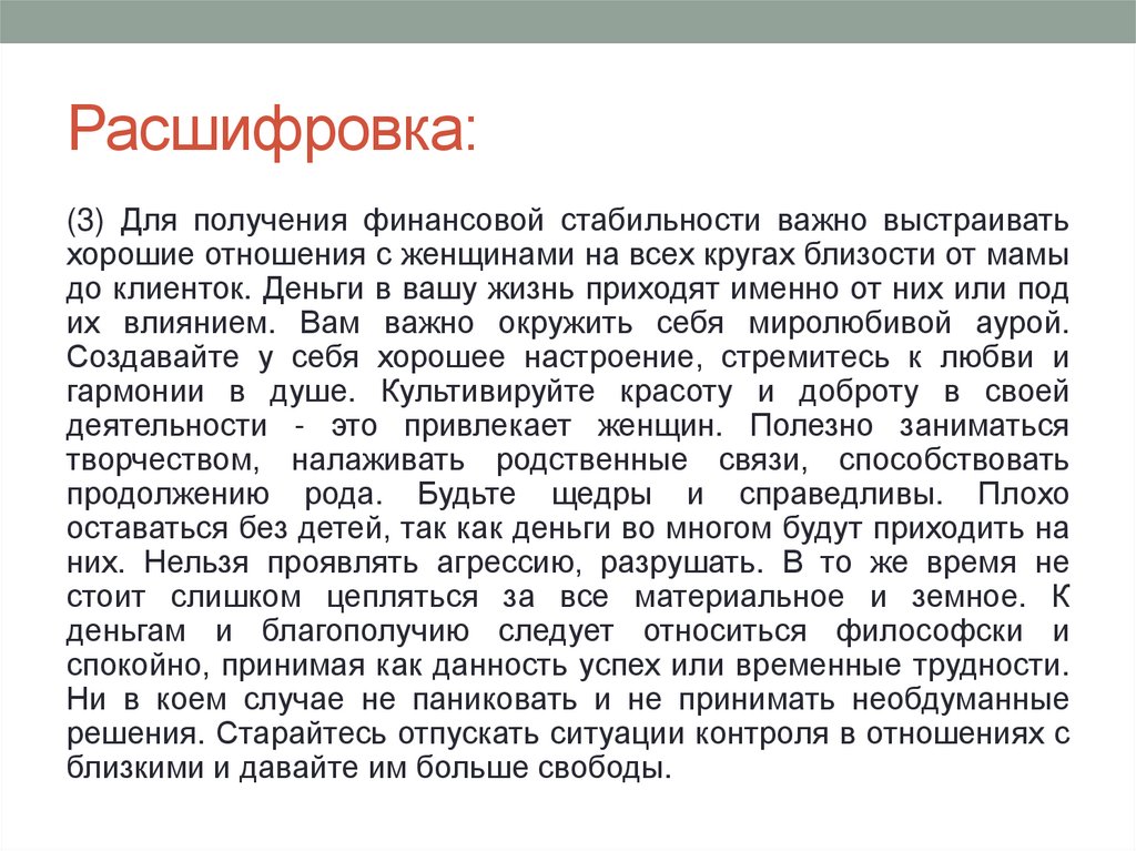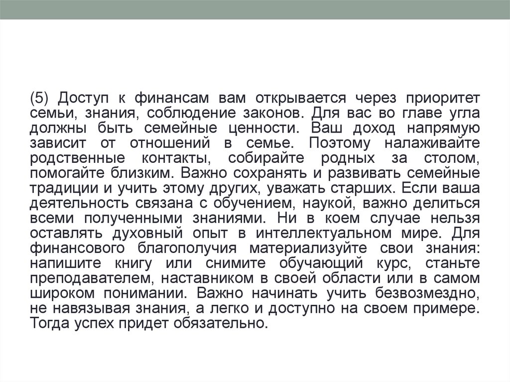 (5) Доступ к финансам вам открывается через приоритетсемьи, знания, соблюдение законов. Для вас во главе угла