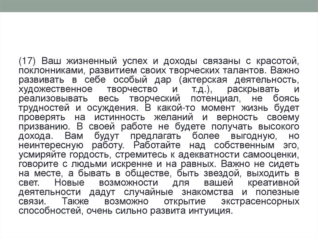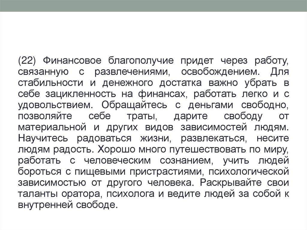 (22) Финансовое благополучие придет через работу,связанную с развлечениями, освобождением. Для
