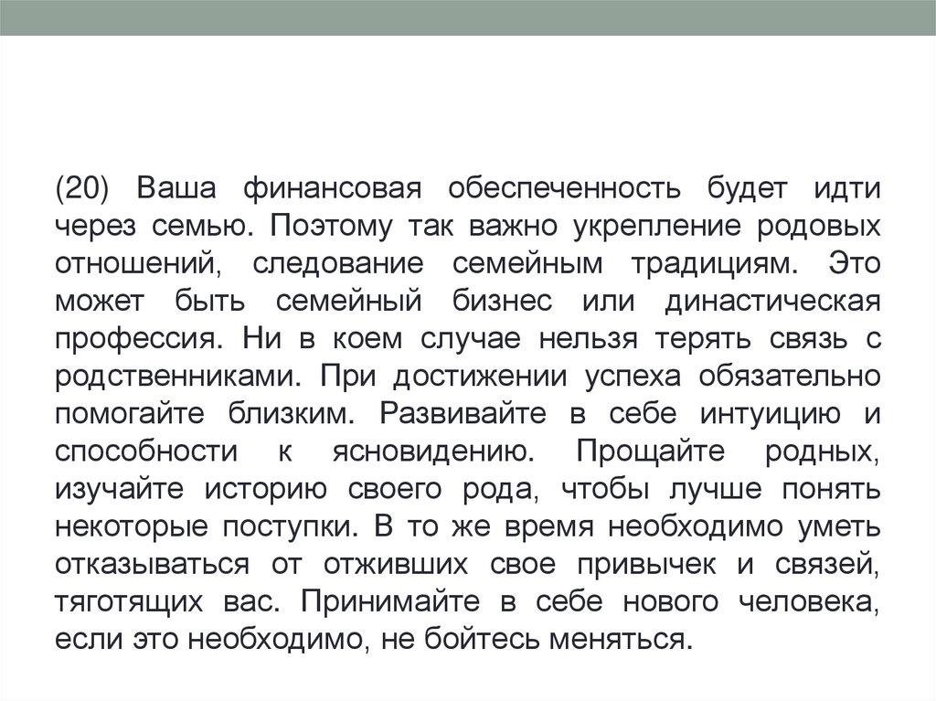 (20) Ваша финансовая обеспеченность будет идтичерез семью. Поэтому так важно укрепление родовых