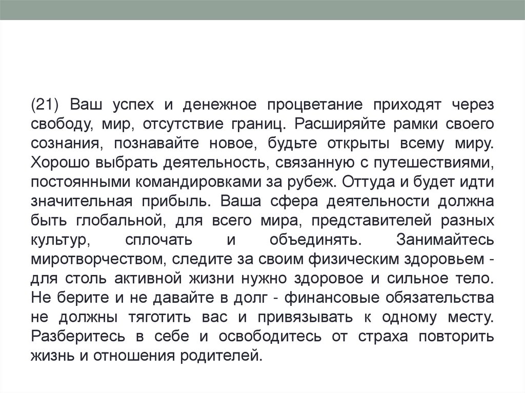 (21) Ваш успех и денежное процветание приходят черезсвободу, мир, отсутствие границ. Расширяйте рамки своего