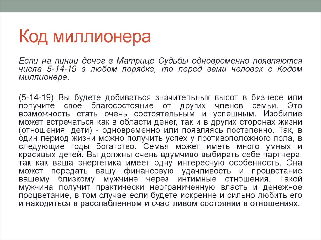 Если на линии денег в Матрице Судьбы одновременно появляютсячисла 5-14-19 в любом порядке, то перед вами человек с Кодом