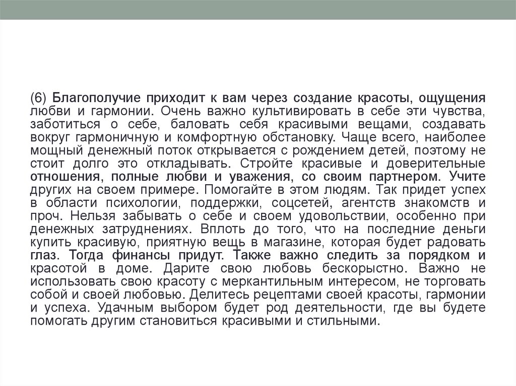 (6) Благополучие приходит к вам через создание красоты, ощущениялюбви и гармонии. Очень важно культивировать в себе эти чувства,