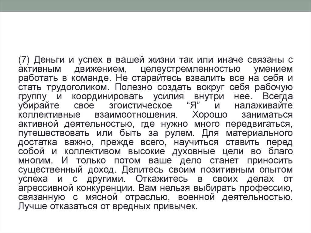 (7) Деньги и успех в вашей жизни так или иначе связаны сактивным движением, целеустремленностью умением