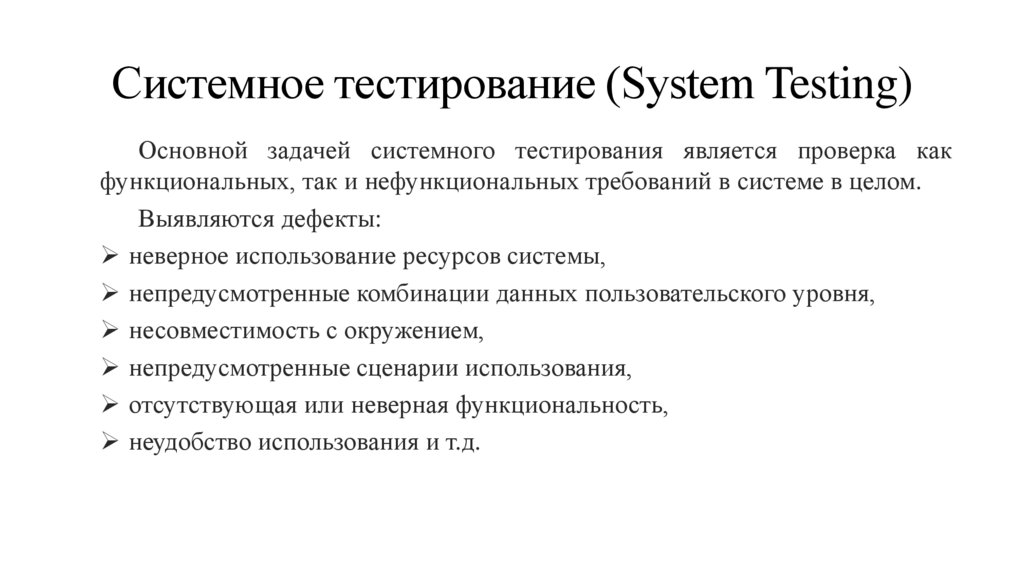 Основной задачей системного тестирования является проверка какфункциональных, так и нефункциональных требований в системе в целом.