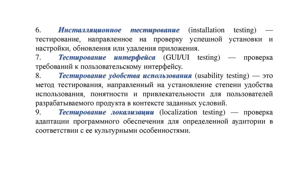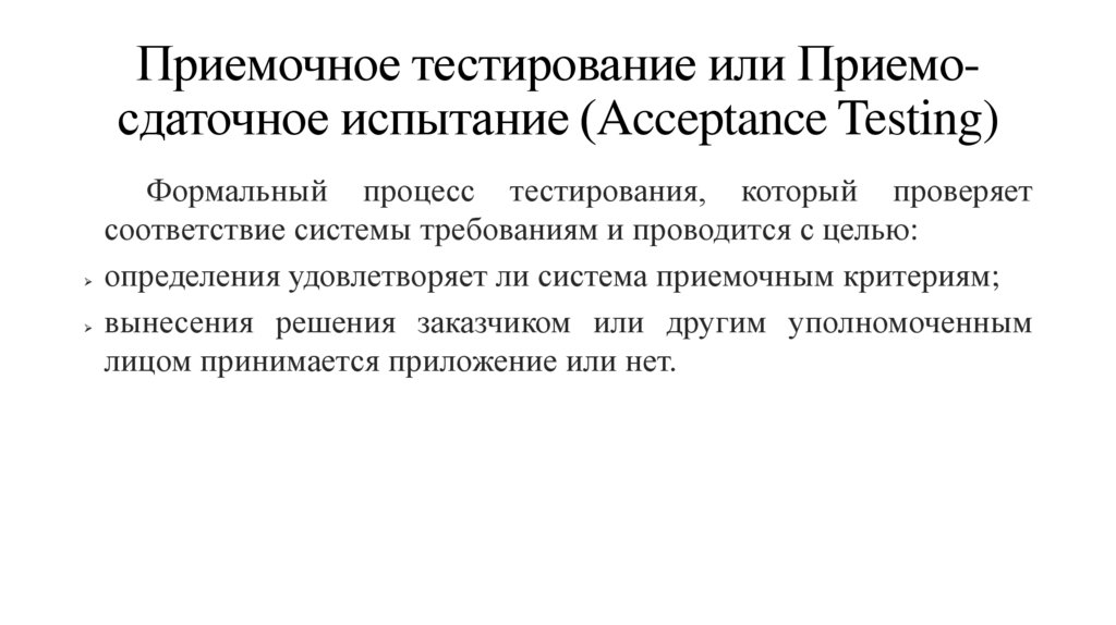 Приемочное тестирование или Приемосдаточное испытание (Acceptance Testing)Формальный процесс тестирования, который проверяет