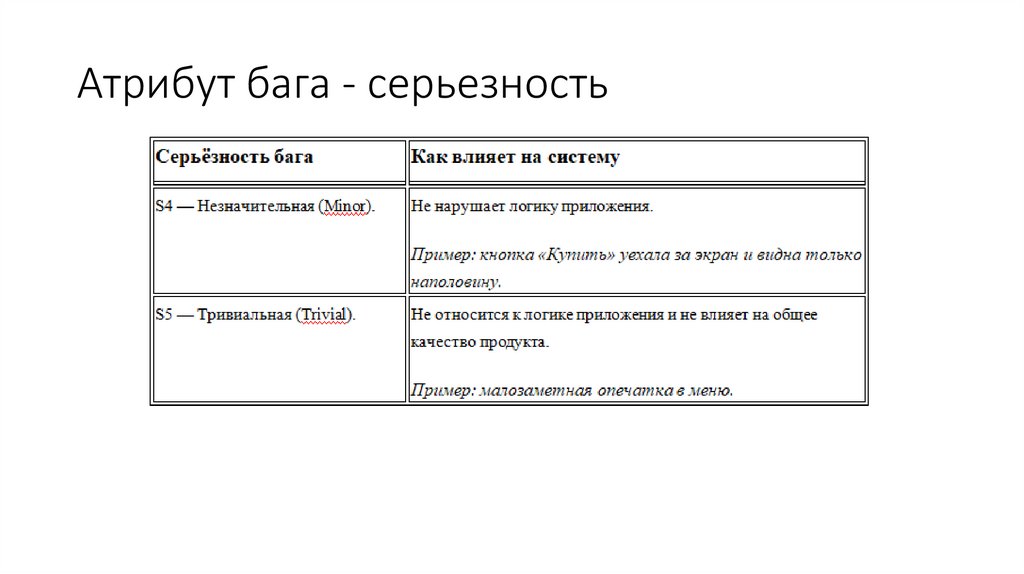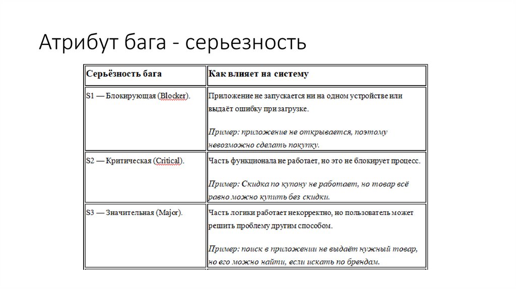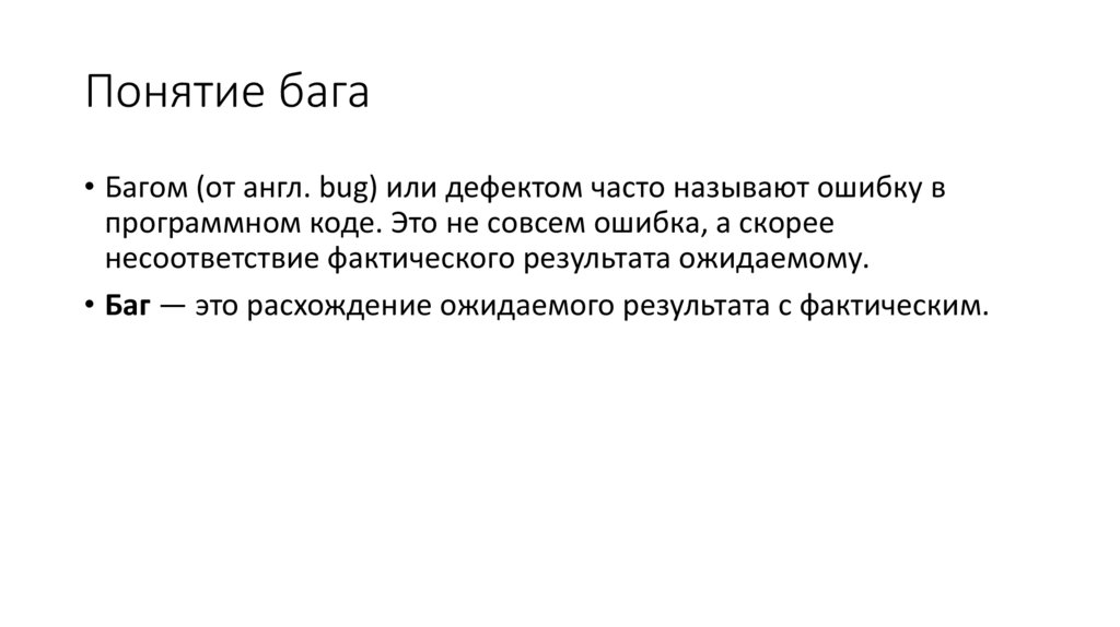 • Баг — это расхождение ожидаемого результата с фактическим.