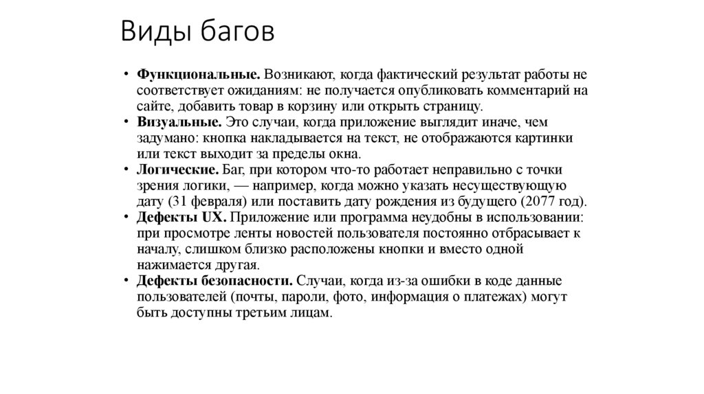 • Дефекты безопасности. Случаи, когда из-за ошибки в коде данные