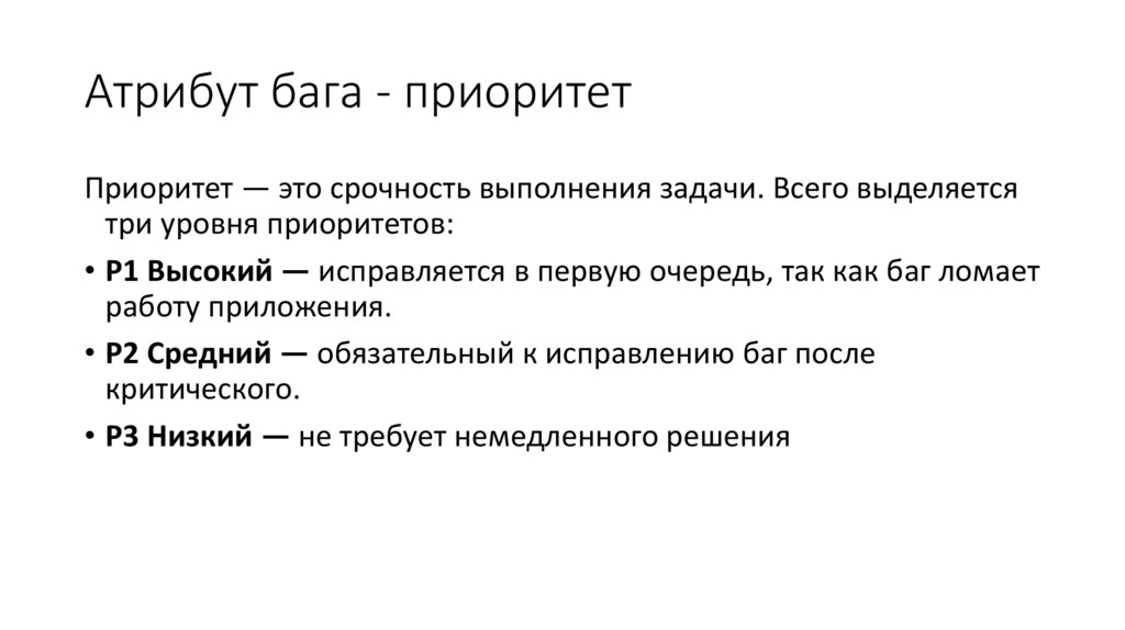 • P1 Высокий — исправляется в первую очередь, так как баг ломает