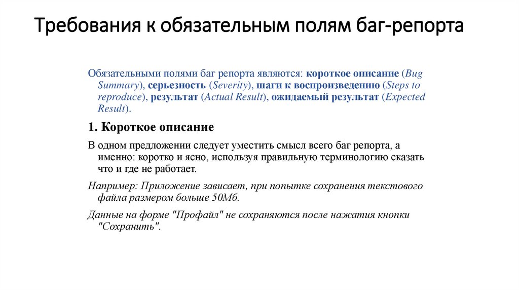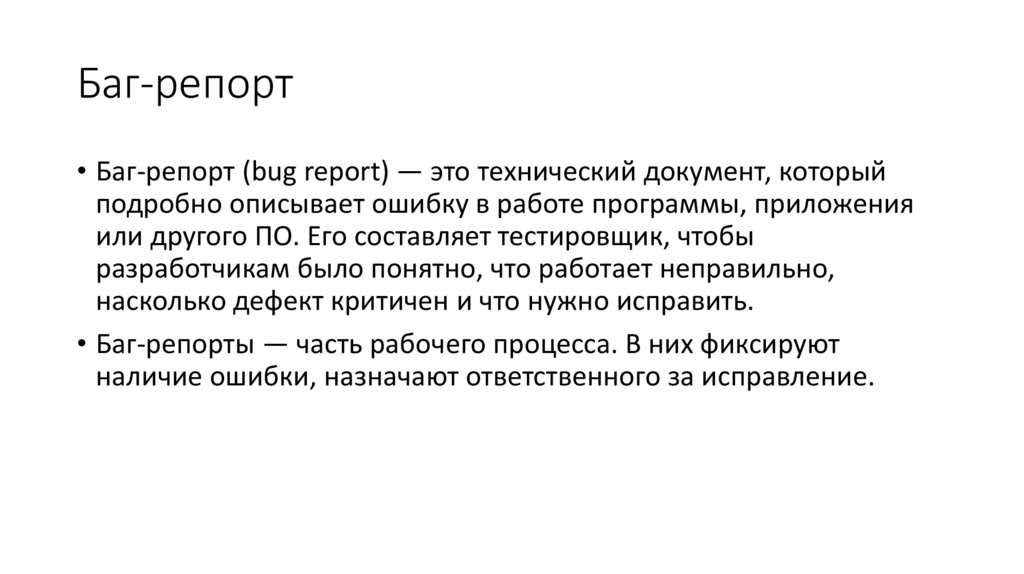 • Баг-репорт (bug report) — это технический документ, которыйподробно описывает ошибку в работе программы, приложения