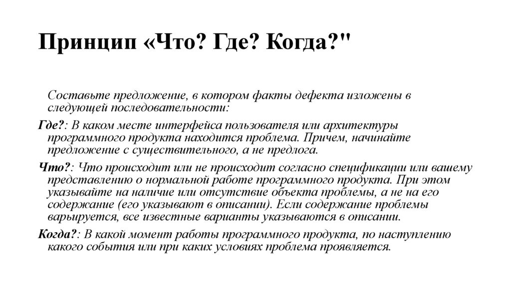 Принцип «Что? Где? Когда?"Составьте предложение, в котором факты дефекта изложены в