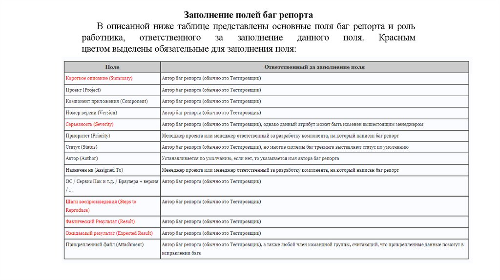 Заполнение полей баг репортаВ описанной ниже таблице представлены основные поля баг репорта и роль