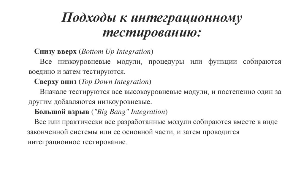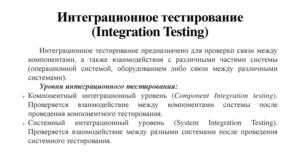 Интеграционное тестирование предназначено для проверки связи междукомпонентами, а также взаимодействия с различными частями системы