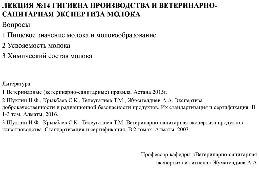 ЛЕКЦИЯ №14 ГИГИЕНА ПРОИЗВОДСТВА И ВЕТЕРИНАРНОСАНИТАРНАЯ ЭКСПЕРТИЗА МОЛОКАВопросы: