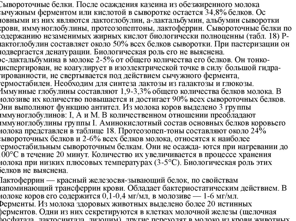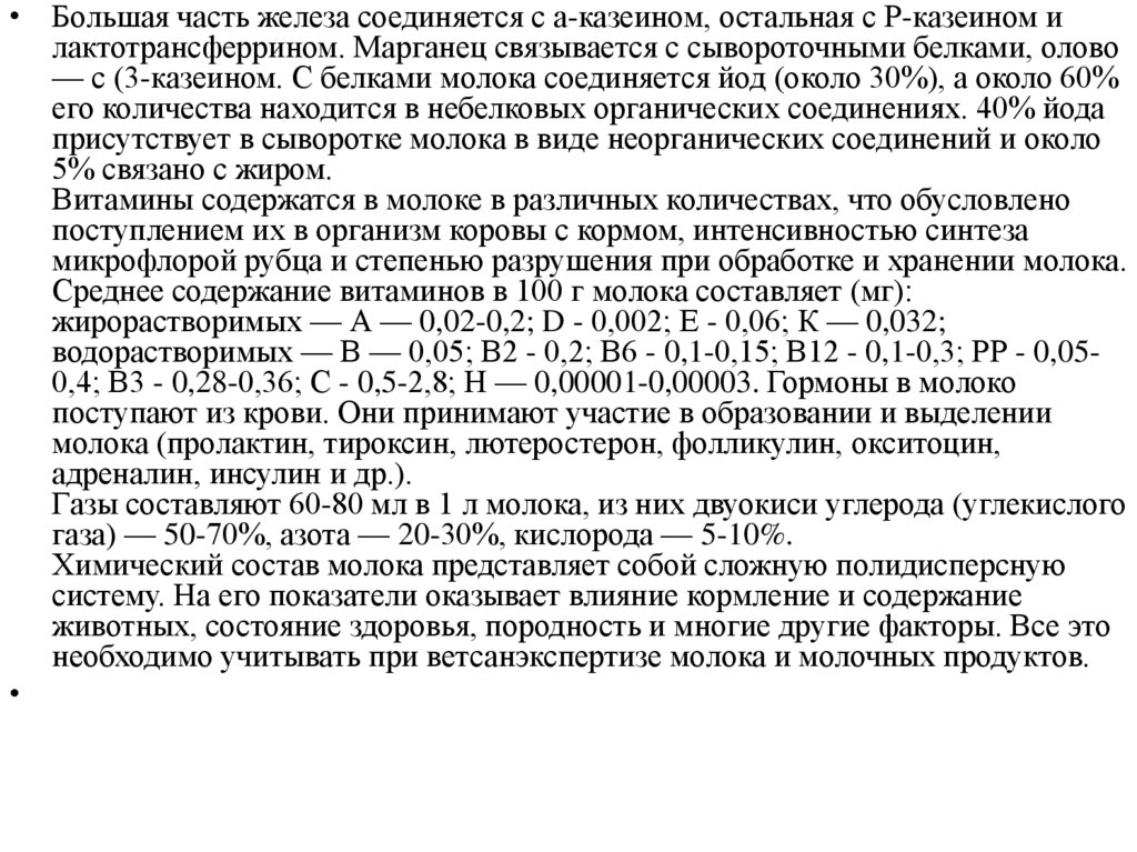 • Большая часть железа соединяется с а-казеином, остальная с Р-казеином илактотрансферрином. Марганец связывается с сывороточными белками, олово