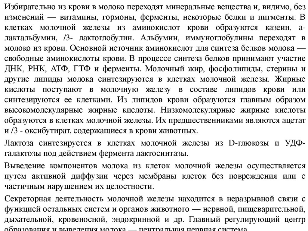 Избирательно из крови в молоко переходят минеральные вещества и, видимо, безизменений — витамины, гормоны, ферменты, некоторые белки и пигменты. В
