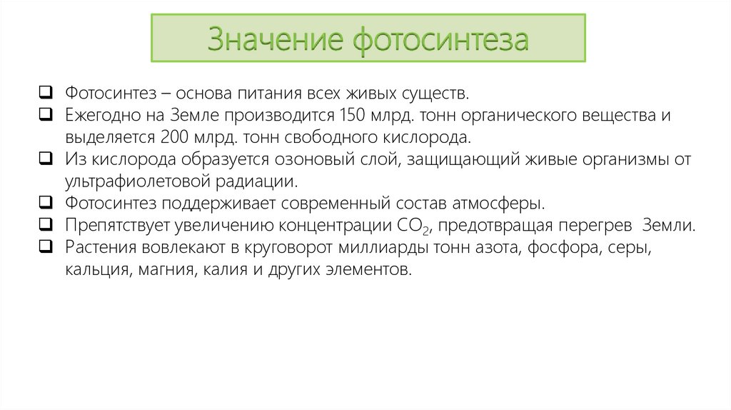 Значение фотосинтезаФотосинтез – основа питания всех живых существ.