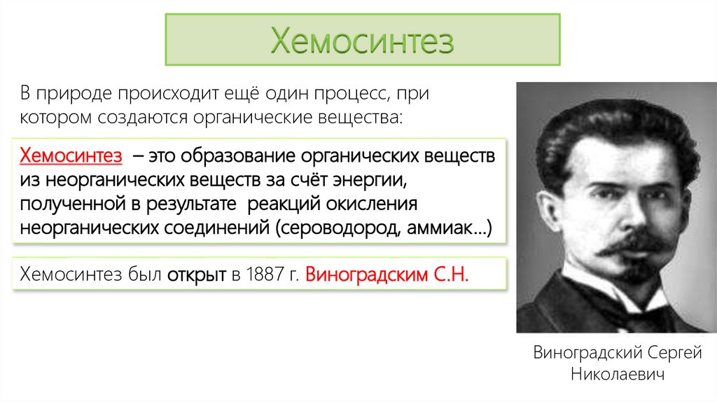 Хемосинтез был открыт в 1887 г. Виноградским С.Н.
