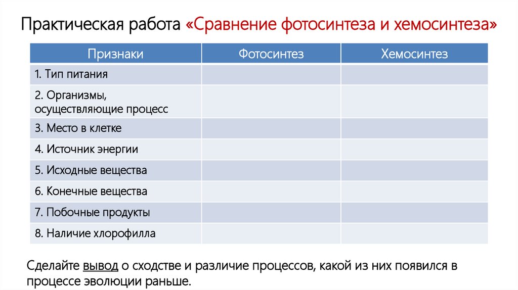 Практическая работа «Сравнение фотосинтеза и хемосинтеза»Признаки