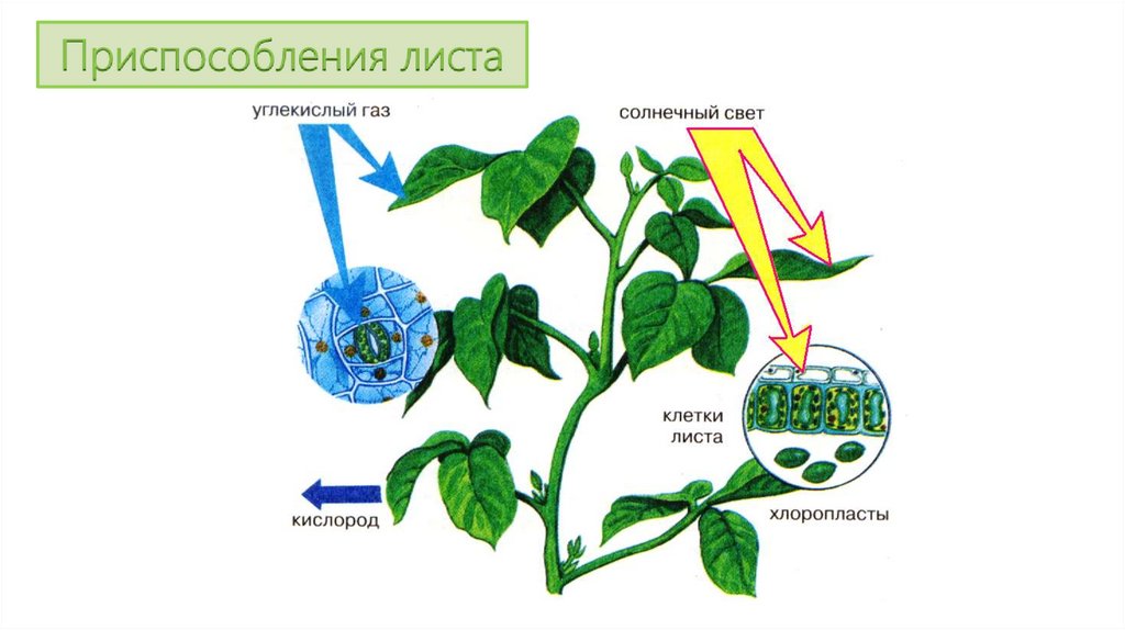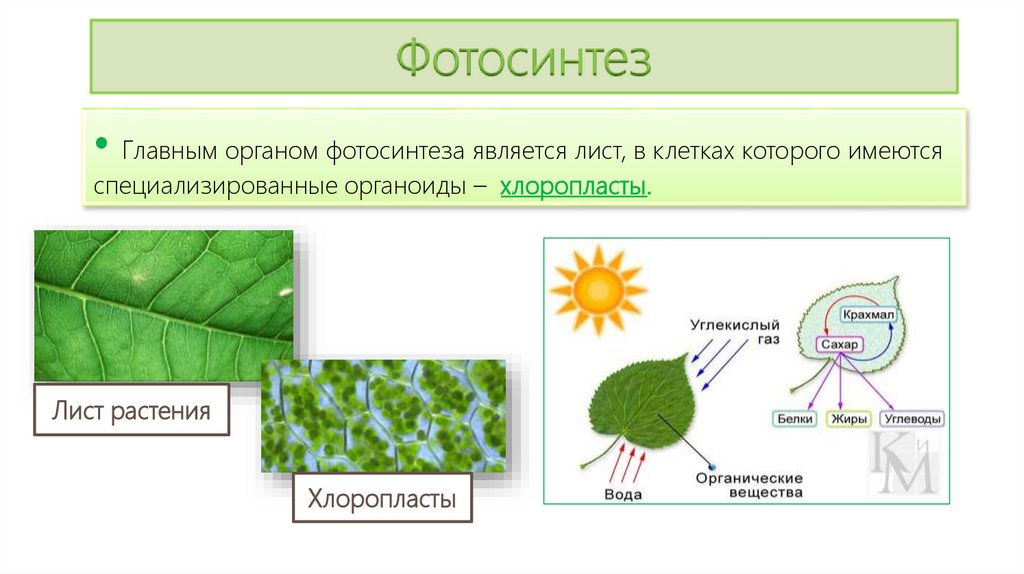 Фотосинтез• Главным органом фотосинтеза является лист, в клетках которого имеются
