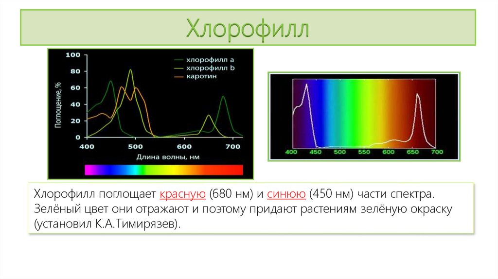 ХлорофиллХлорофилл поглощает красную (680 нм) и синюю (450 нм) части спектра.