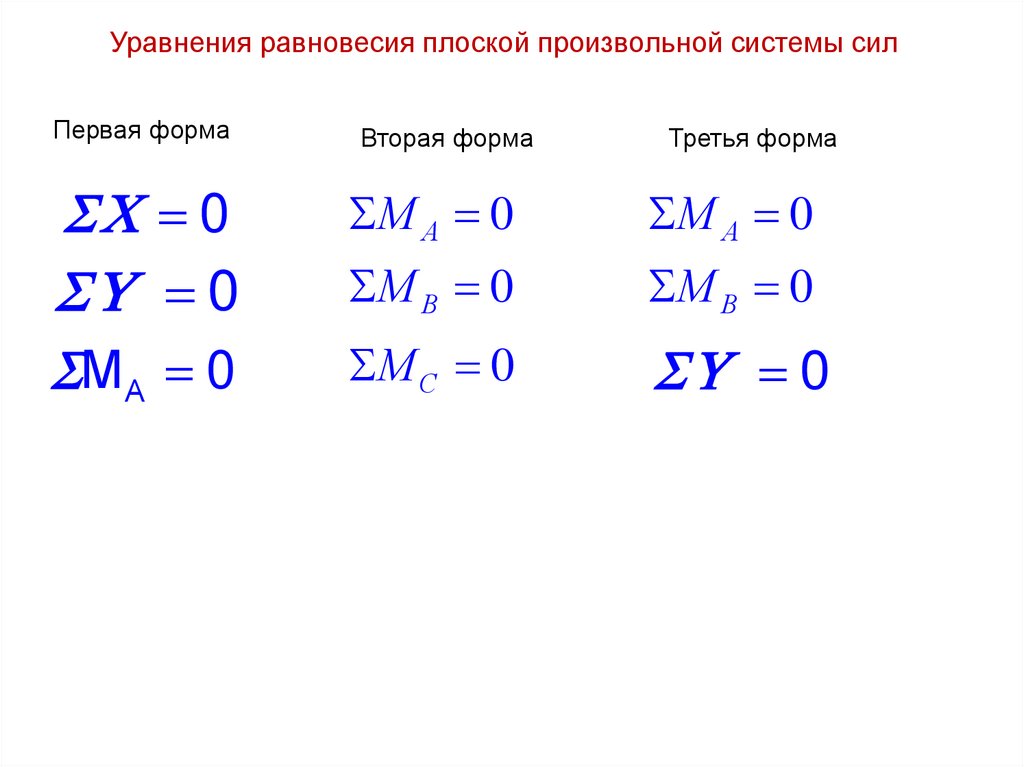 Уравнения равновесия плоской произвольной системы силПервая форма