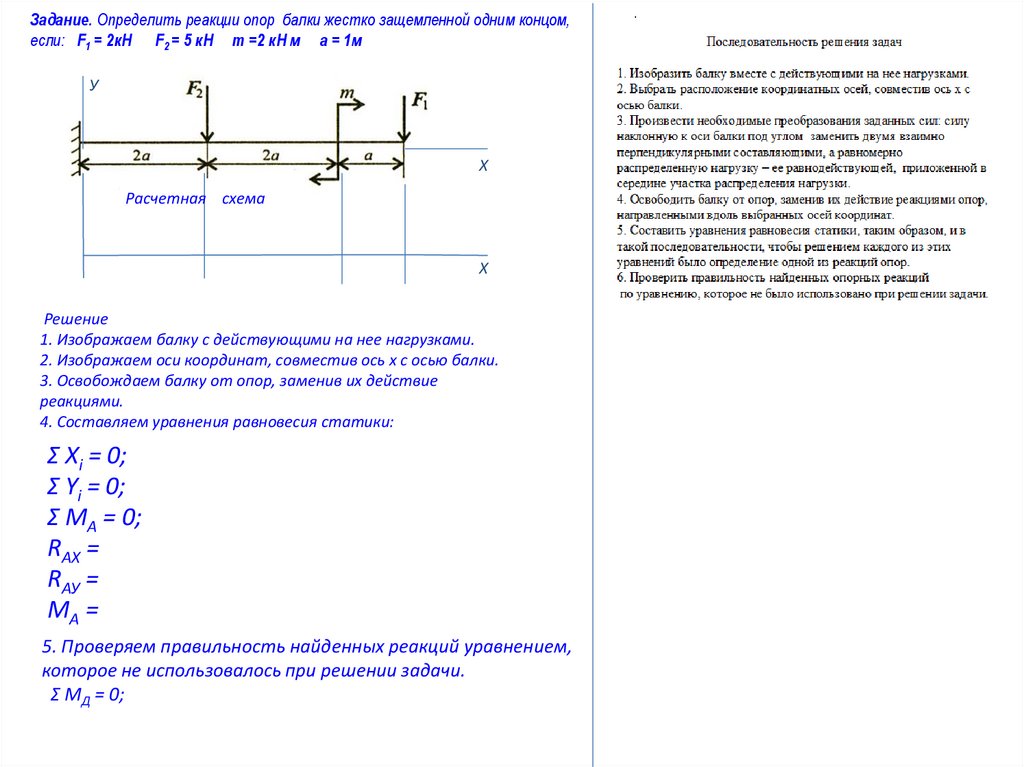 Задание. Определить реакции опор балки жестко защемленной одним концом,если: F1 = 2кН F2 = 5 кН m =2 кН м а = 1м
