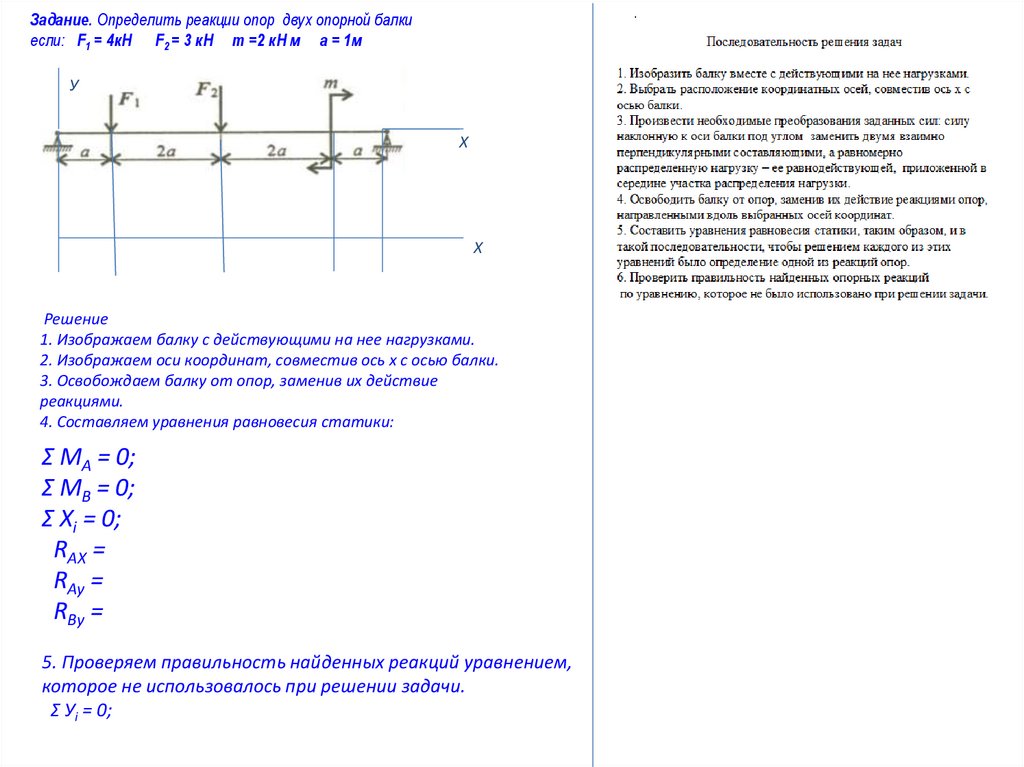 Задание. Определить реакции опор двух опорной балкиесли: F1 = 4кН F2 = 3 кН m =2 кН м а = 1м