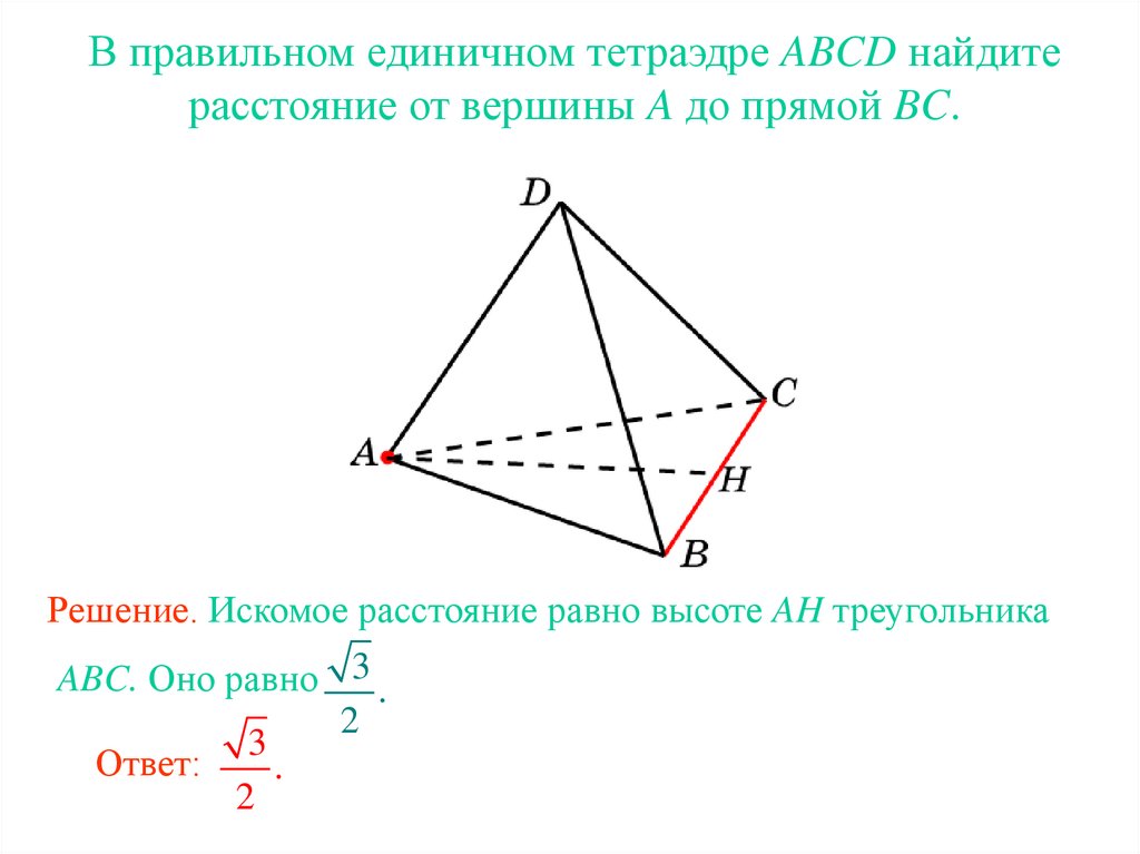 В правильном единичном тетраэдре ABCD найдитерасстояние от вершины A до прямой BC.
