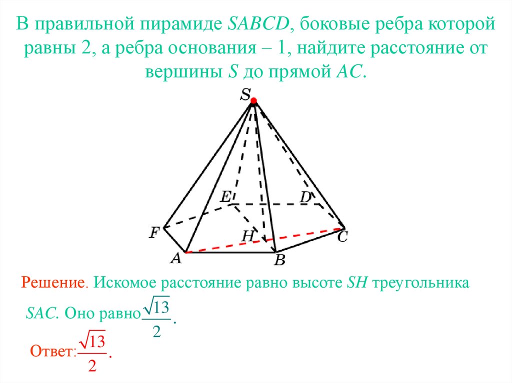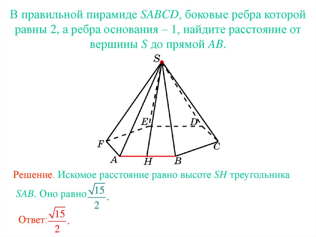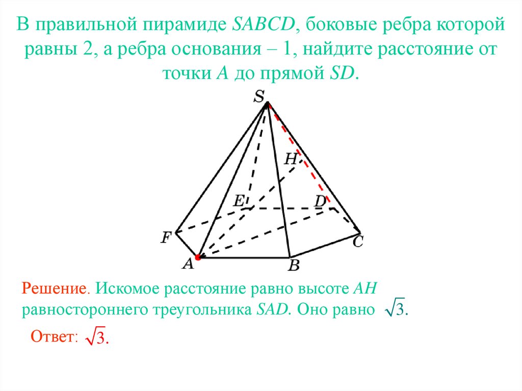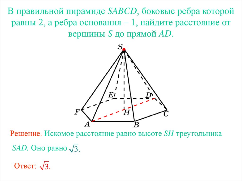 В правильной пирамиде SABCD, боковые ребра которойравны 2, а ребра основания – 1, найдите расстояние от