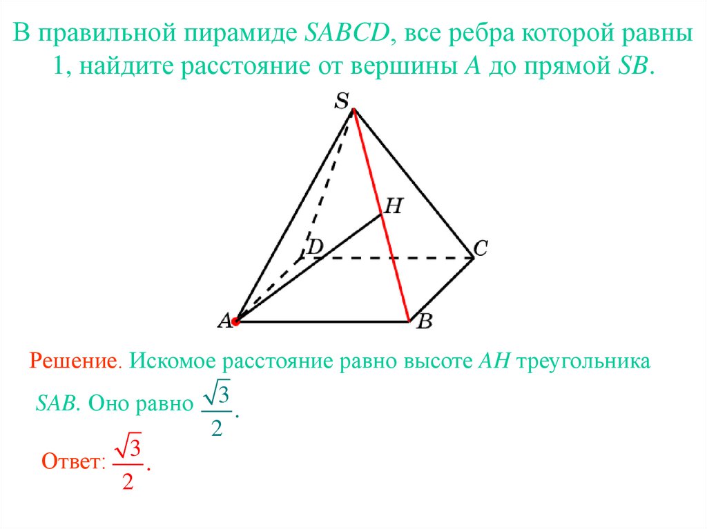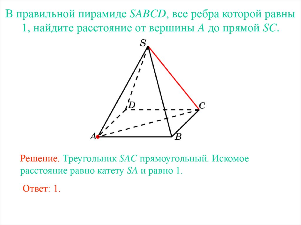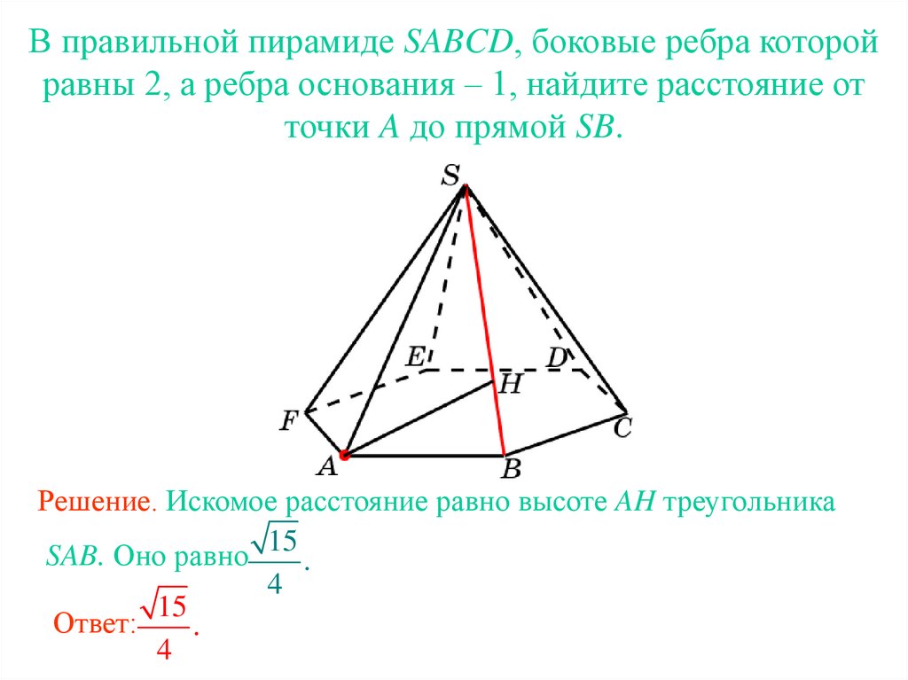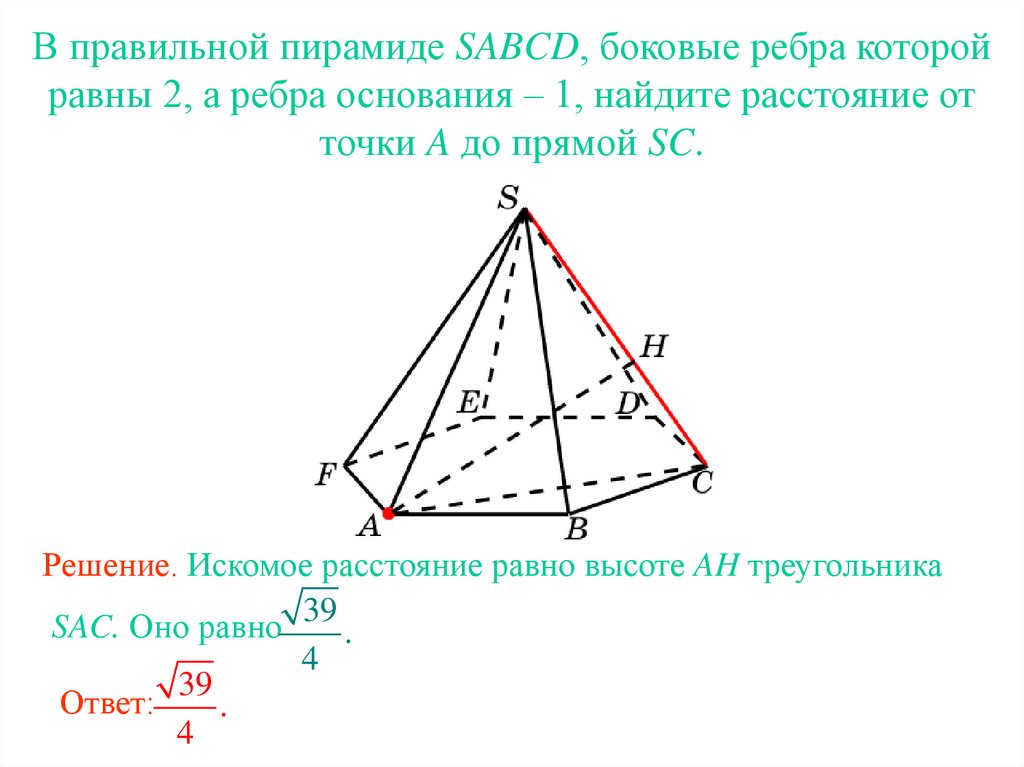 В правильной пирамиде SABCD, боковые ребра которойравны 2, а ребра основания – 1, найдите расстояние от