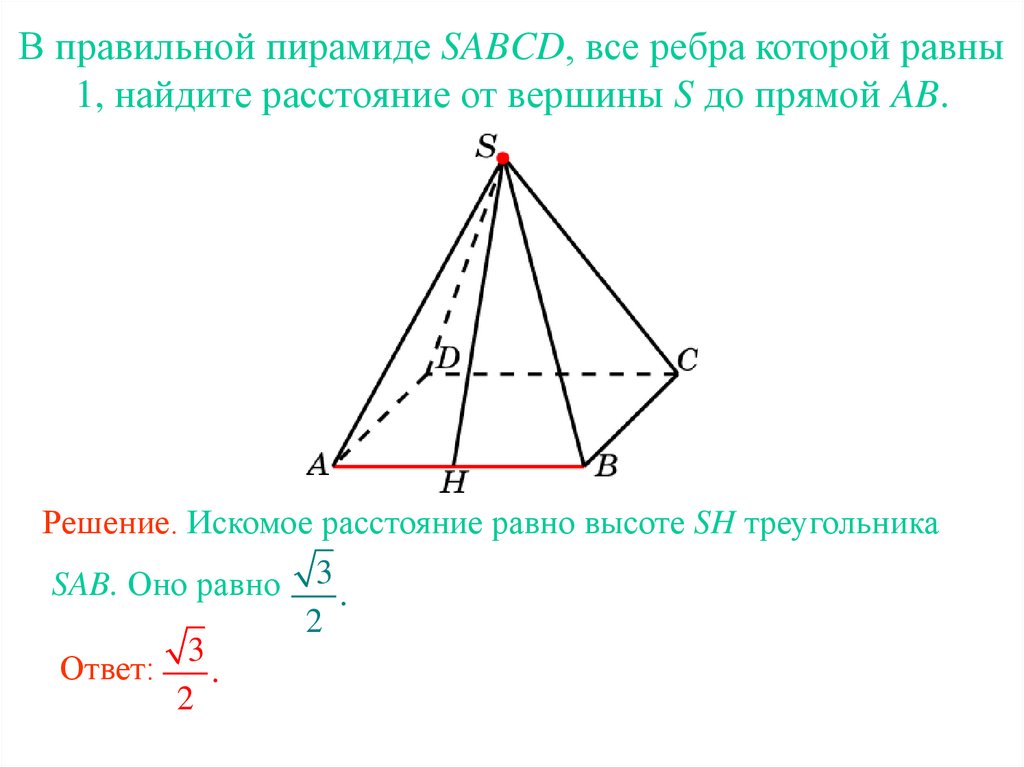В правильной пирамиде SABCD, все ребра которой равны1, найдите расстояние от вершины S до прямой AB.