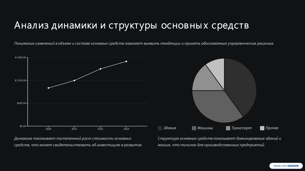 Анал из динамики и структ уры основ ны х средствПонимание изменений в объеме и составе основных средств помогает выявить тенденции и принять обоснованные управленческие решения.
