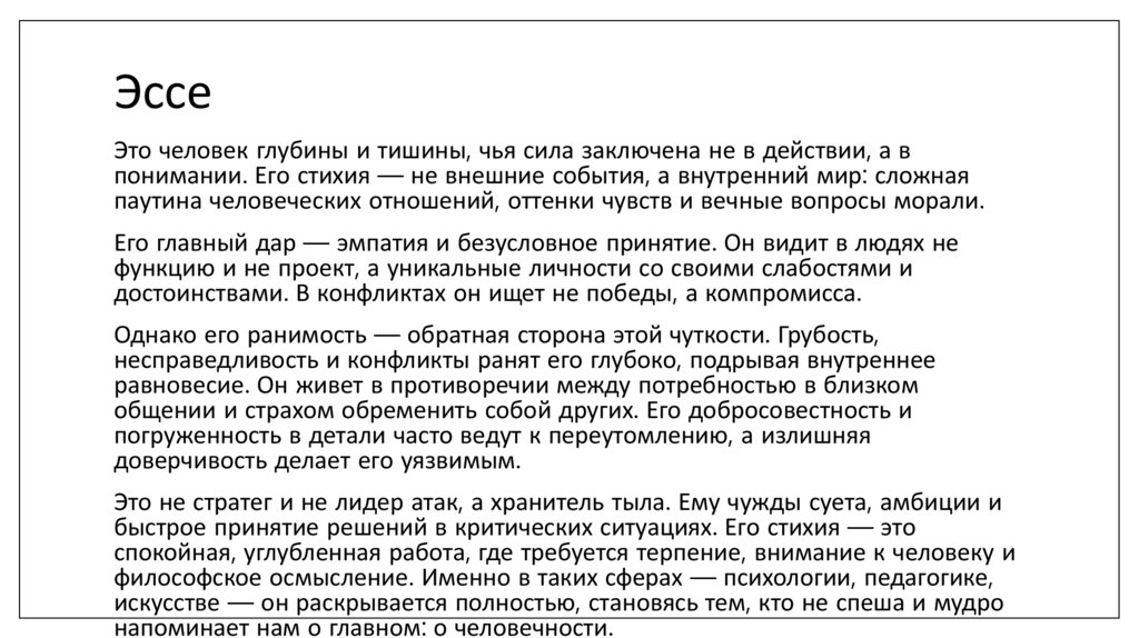Это человек глубины и тишины, чья сила заключена не в действии, а впонимании. Его стихия — не внешние события, а внутренний мир: сложная