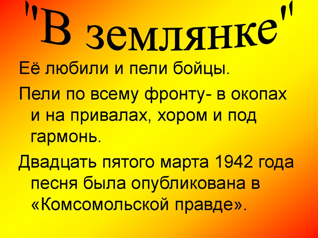 Её любили и пели бойцы.Пели по всему фронту- в окопах