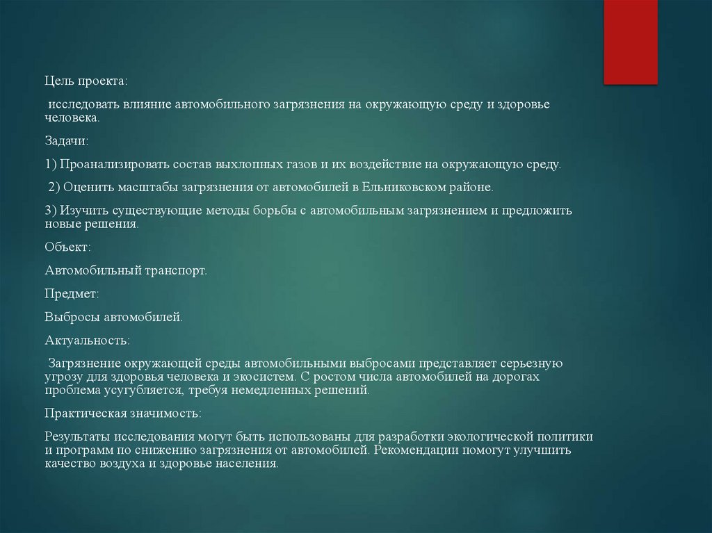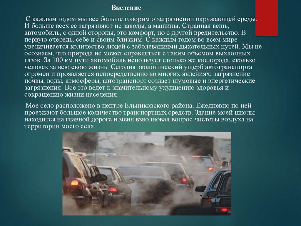Цель проекта:исследовать влияние автомобильного загрязнения на окружающую среду и здоровье