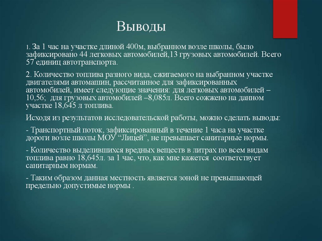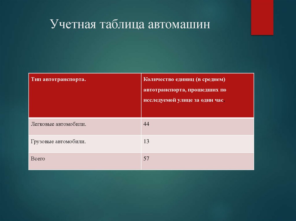 1. За 1 час на участке длиной 400м, выбранном возле школы, былозафиксировано 44 легковых автомобилей,13 грузовых автомобилей. Всего
