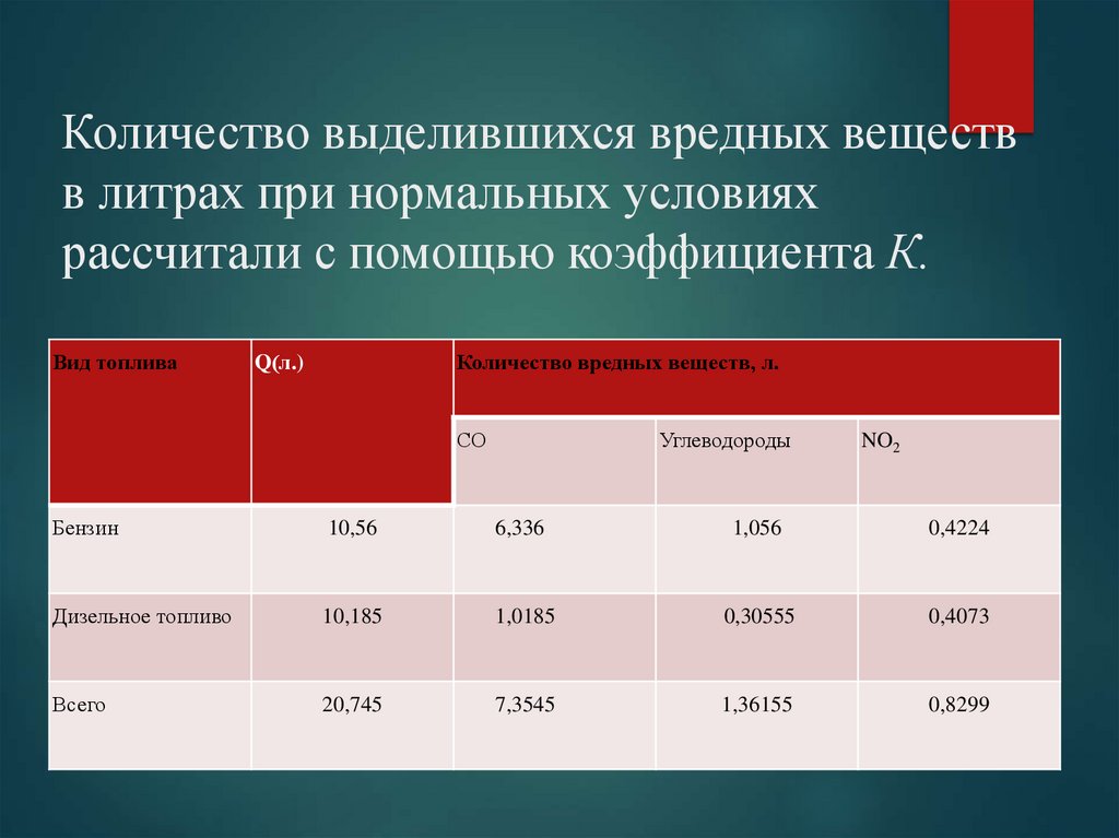 8. Количество выделившихся вредных веществ в литрах при нормальных условиях рассчитали с помощью коэффициента К.