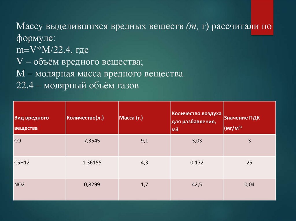9. Массу выделившихся вредных веществ (т, г) рассчитали по формуле: m=V*M/22.4, где V – объём вредного вещества; М – молярная