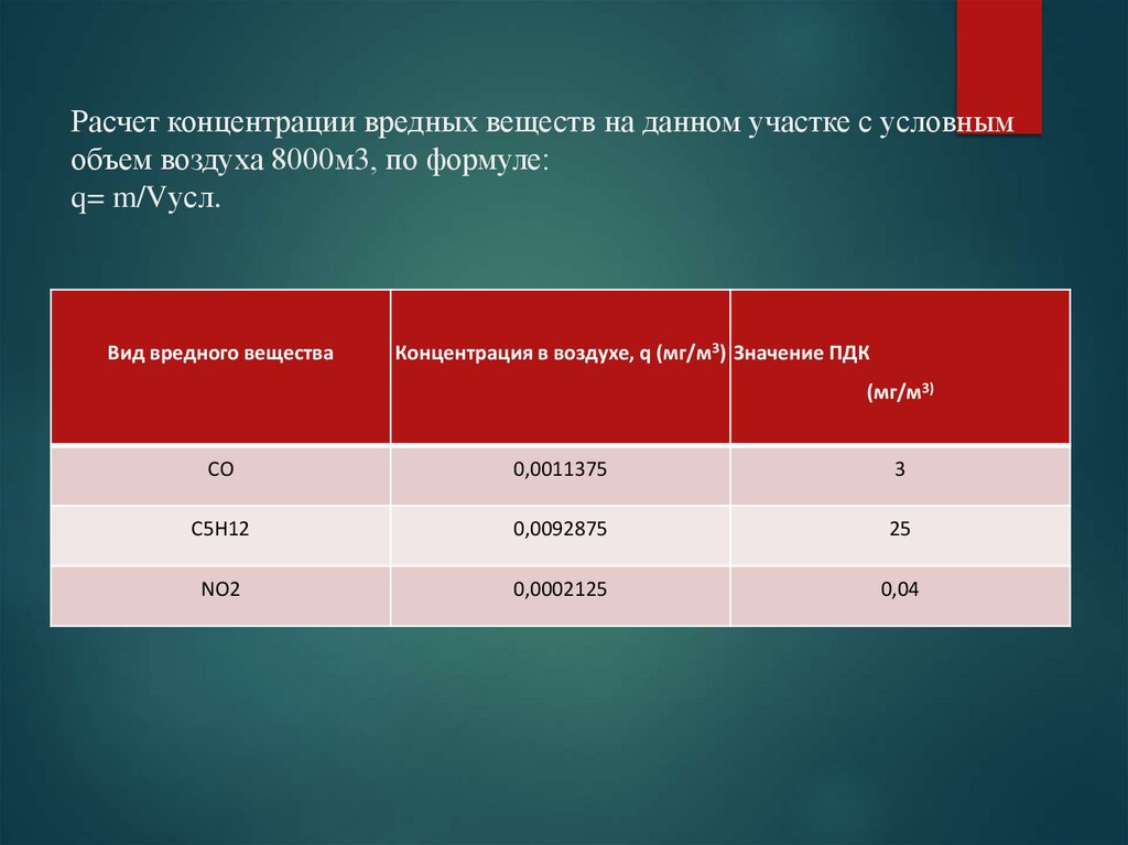 10. Расчет концентрации вредных веществ на данном участке с условным объем воздуха 8000м3, по формуле: q= m/Vусл.
