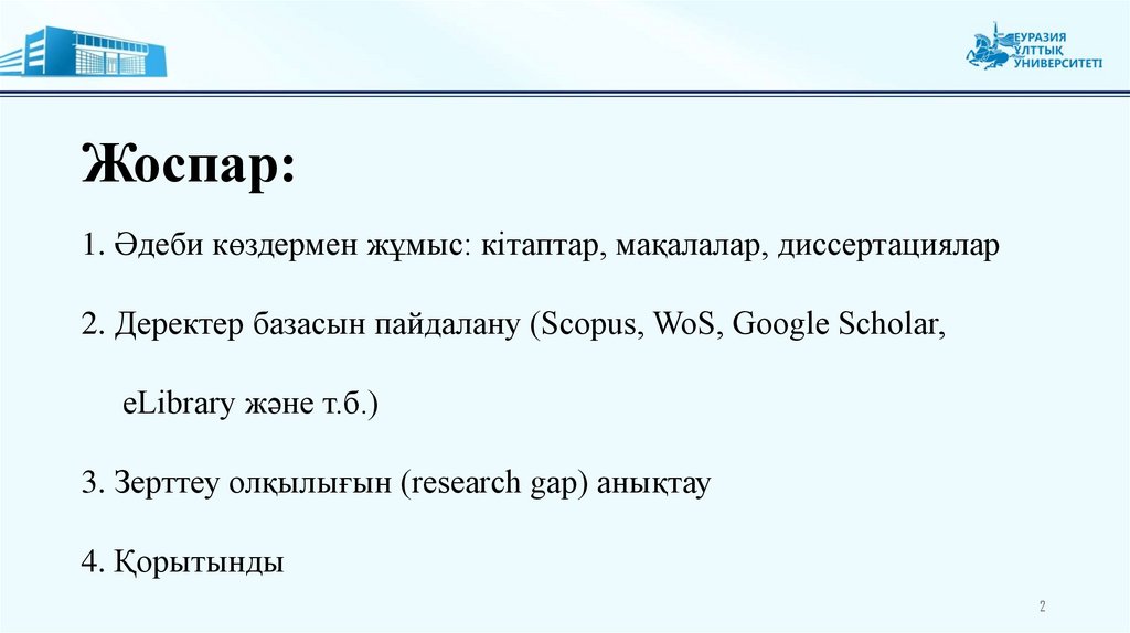 2. Деректер базасын пайдалану (Scopus, WoS, Google Scholar,